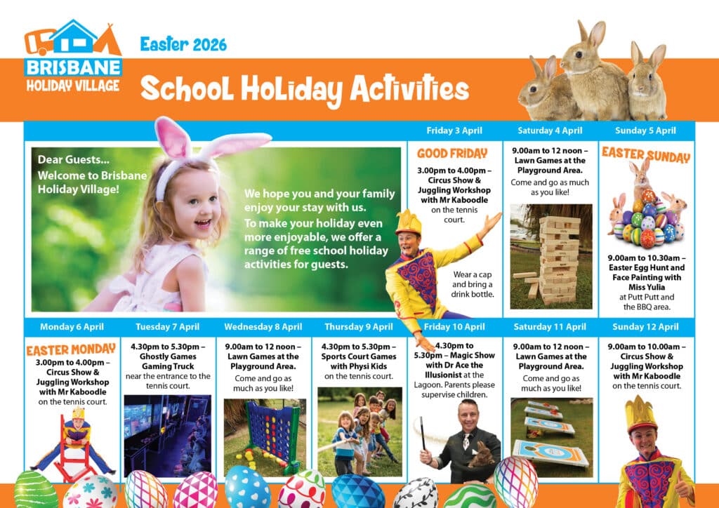 We’re all about creating the best possible family getaway at Brisbane Holiday Village. That’s why we offer a great range of FREE activities for our guests throughout the school holidays.