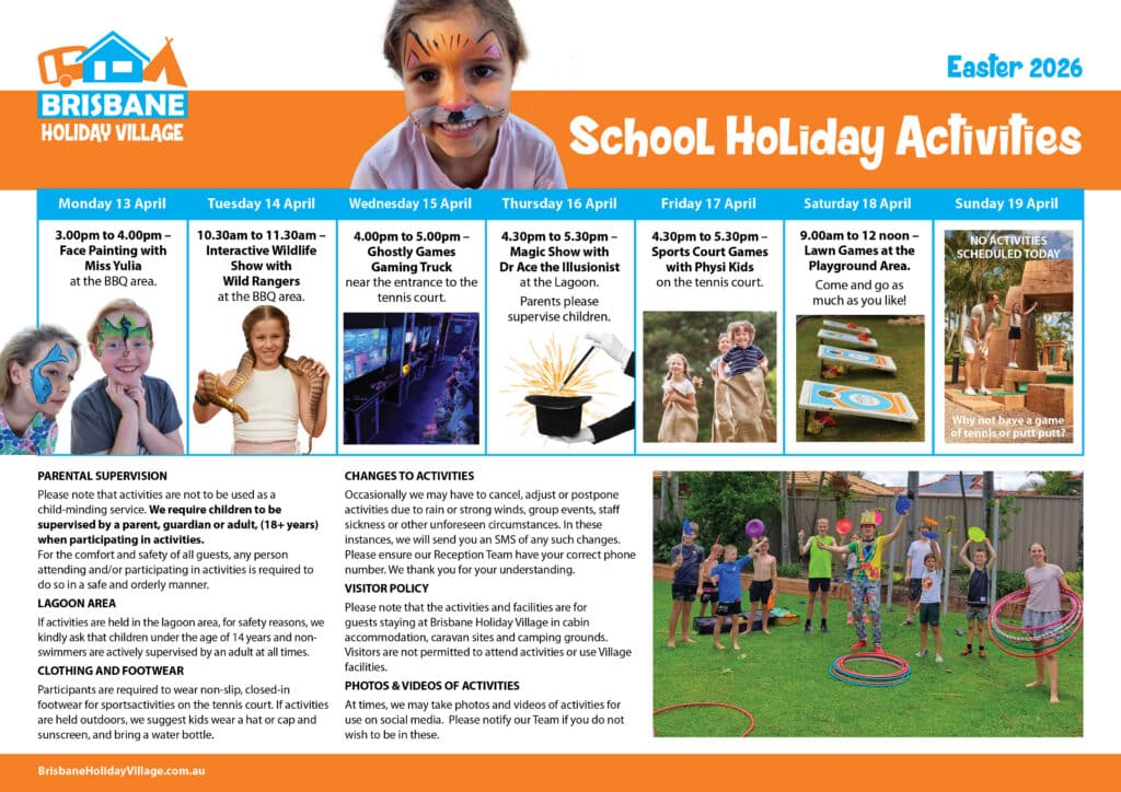 If minimum numbers are not met, holiday activities may be cancelled. Brisbane Holiday Village may need to make adjustments to holiday activities and cancel others depending on weather events, availability etc. In these instances, we will send guests staying in the Village an SMS of any such changes.